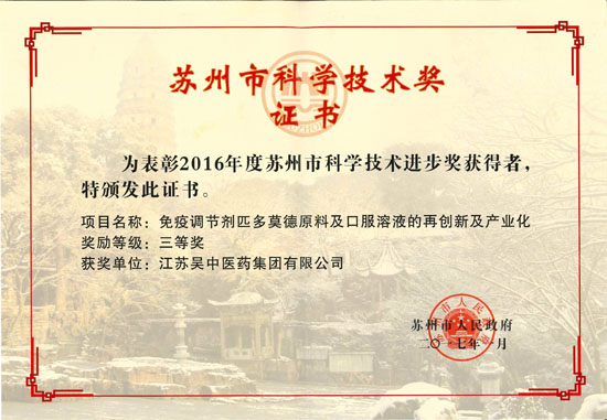 匹多莫德原料及口服溶液榮獲蘇州市科學(xué)技術(shù)進(jìn)步三等獎(jiǎng)