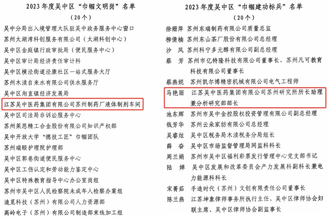 吳中醫藥蘇州制藥廠液體制劑車間榮獲2023年度吳中區“巾幗文明崗”稱號,吳中醫藥蘇州研究所所長助理兼分析研究部部長馬艷麗榮獲2023年度吳中區“巾幗建功標兵”稱號。