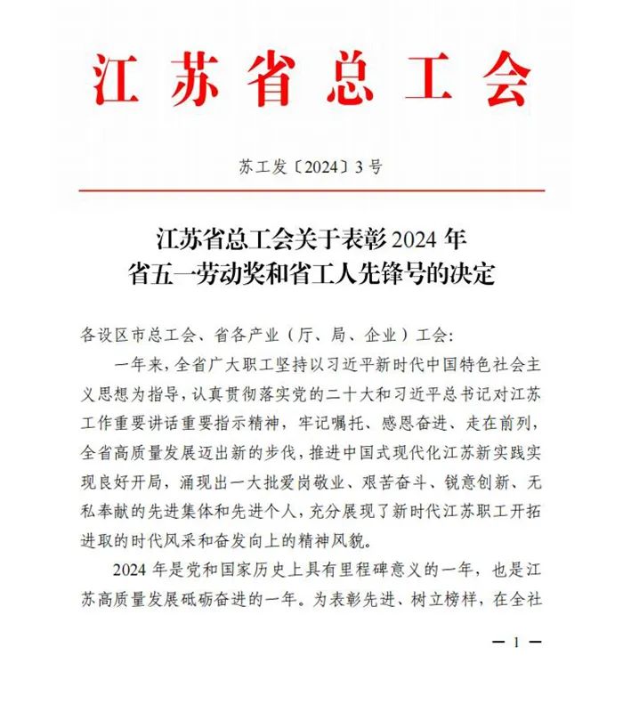 榮譽:母公司獲評江蘇省五一勞動獎狀 日期:2024年4月23日