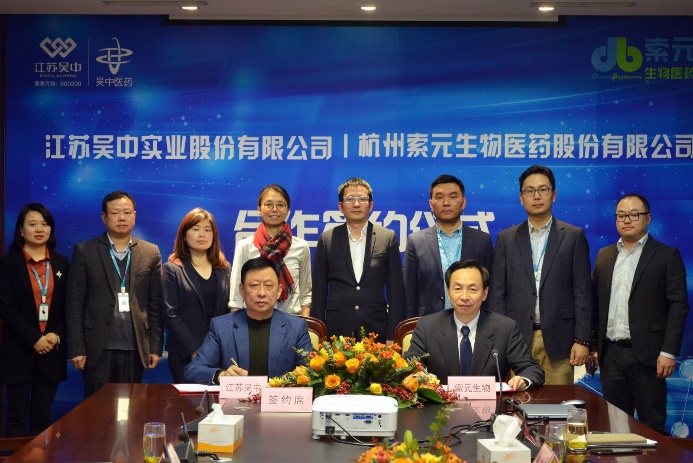 11月30日,江蘇吳中醫藥集團有限公司與杭州索元生物醫藥股份有限公司達成研發戰略合作,并簽署關于一類新藥重組人血管內皮抑素項目的轉讓與許可協議。股份公司董事長、首席執行官錢群山,股份公司副董事長、醫藥集團董事長姚建林,股份公司副總裁、醫藥集團總經理孫田江;杭州索元生物醫藥股份有限公司董事長羅文,董事會秘書、首席財務官陳紀正等出席合作簽約儀式。股份公司副董事長、醫藥集團董事長姚建林與索元生物董事長羅文簽署合作協議 ...